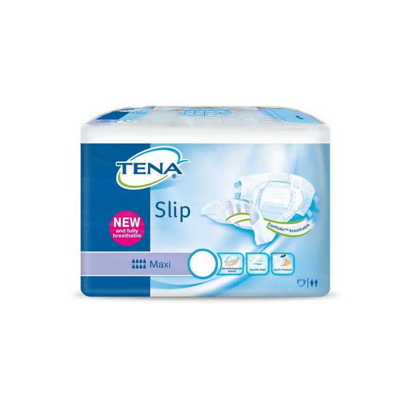 La gamme Maxi offre la capacité d'absorption la plus élevée de la gamme Tena Slip. Ainsi ce change est indiqué pour une utilisation la nuit mais il peut être utilisé le jour si une absorption élevée est necessaire.