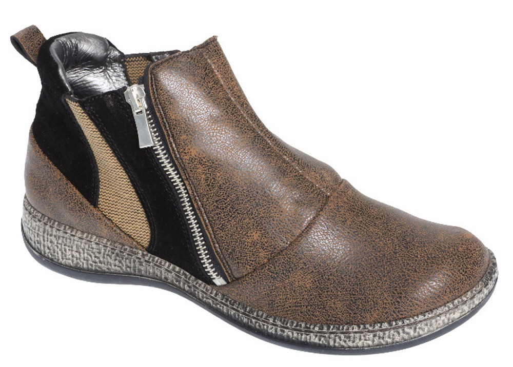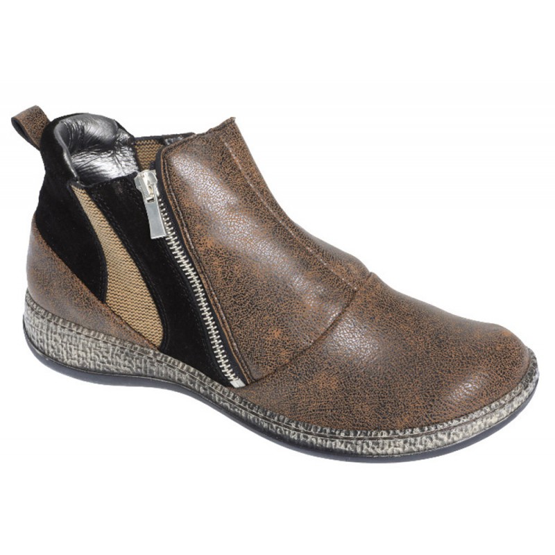 Bottine femme à grande ouverture, extensible sur l'avant, réglages par glissières latérales, bon maintien, avec semelle amovible.
