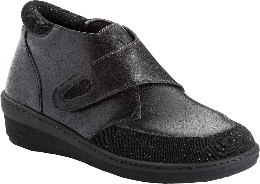 Bottine femme à grande ouverture, extensible sur les cotés, avec réglage par bande auto-agrippante sur le coup de pied.